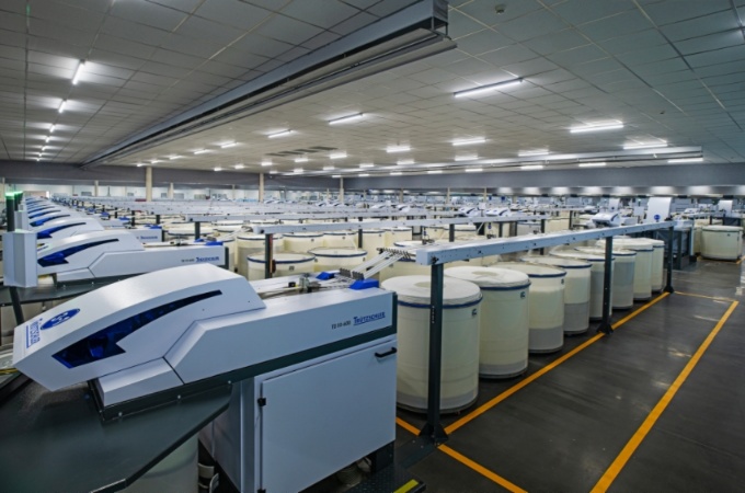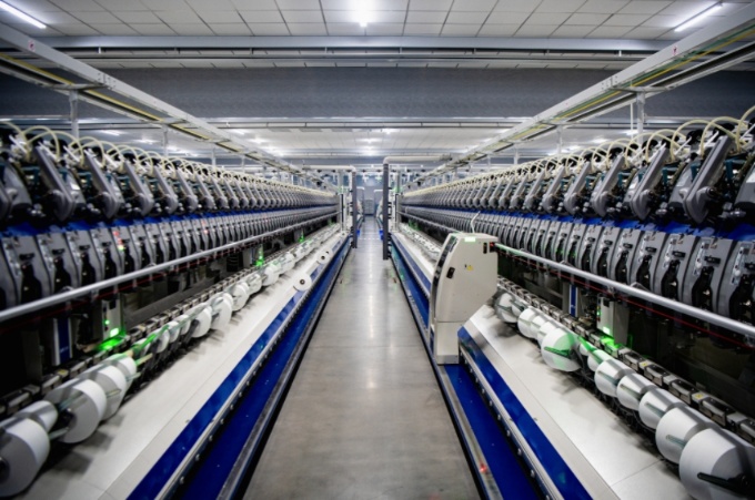 清花,梳棉,并条……每一道工序都由从动化机械承担,涡流纺区域,纯洁的涤纶条被机械卷入,转眼间变成光莹的丝线被吐出。雪白纱锭高速扭转,细如发丝的纱线正在涡流纺纱设备中快速成型。粗细联区域,智能落纱机械人沿着轨道挪动,智能轨道取地面的AGV小车形成立体物流收集,正杂乱无章地转运成品筒纱…。
