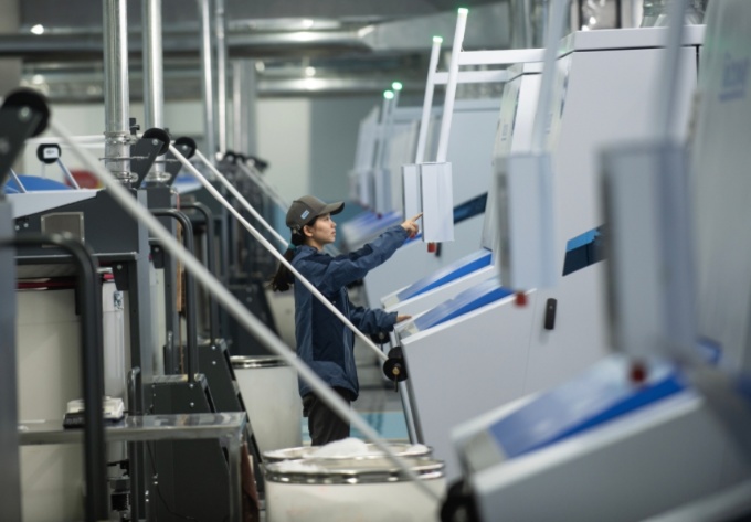 清花,梳棉,并条……每一道工序都由从动化机械承担,涡流纺区域,纯洁的涤纶条被机械卷入,转眼间变成光莹的丝线被吐出。雪白纱锭高速扭转,细如发丝的纱线正在涡流纺纱设备中快速成型。粗细联区域,智能落纱机械人沿着轨道挪动,智能轨道取地面的AGV小车形成立体物流收集,正杂乱无章地转运成品筒纱…。
