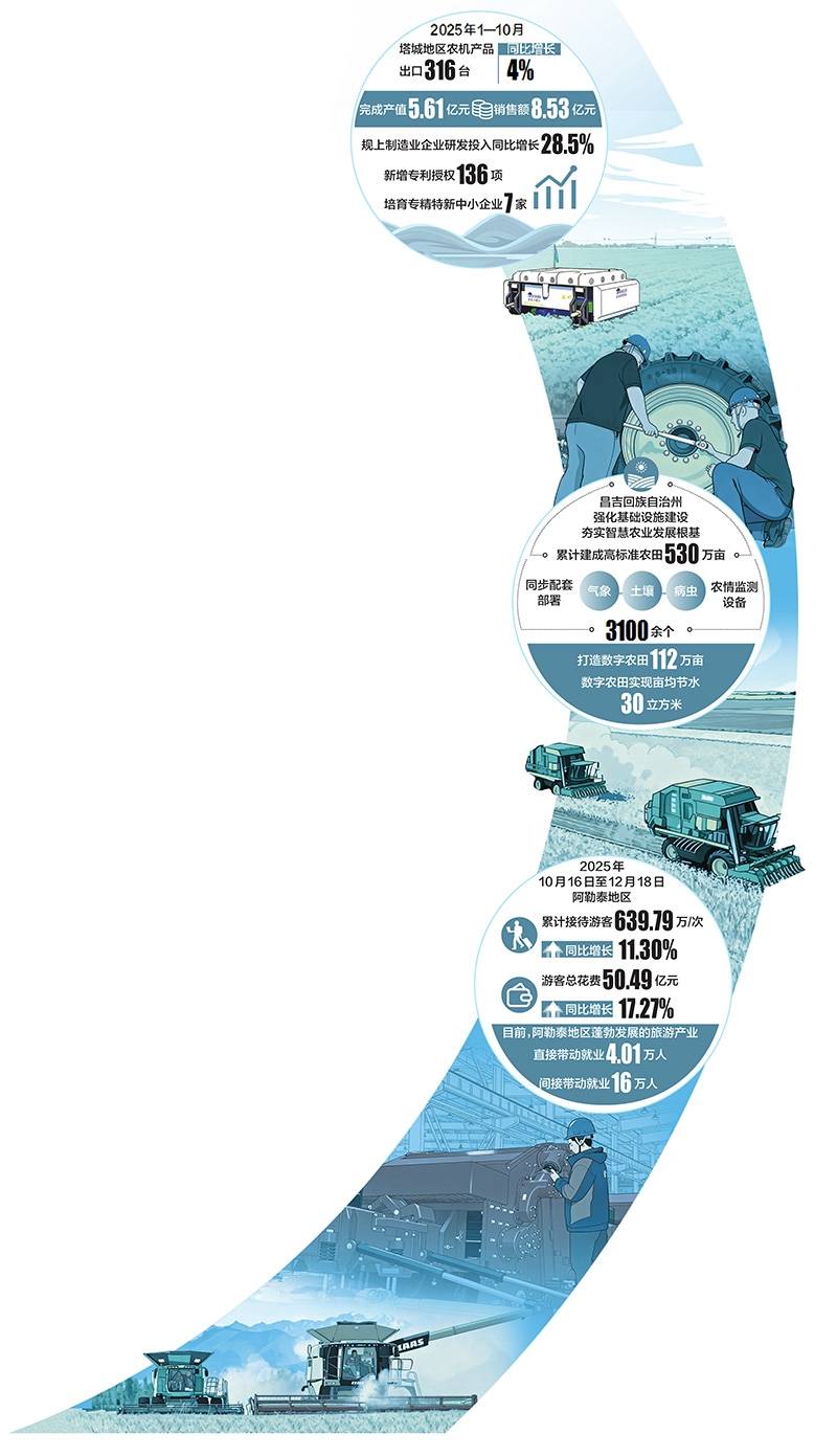 岁末之际,北疆大地处处涌动着兴旺朝气取立异活力。从智能农机产销两旺到数字农田“云端”办理,从冰雪高潮点燃消费新引擎到物流枢纽贯通能源动脉,一幅以“新”为底色的成长画卷正缓缓展开。本期北疆察看版年终清点,聚焦四组活泼实践,看新手艺、新财产、新模式若何汇聚成新质出产力,为区域高质量成长注入强劲动能。